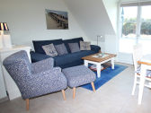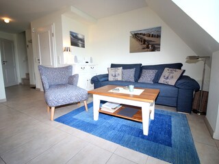 Diese schöne 3-Zimmer Ferienwohnung im Obergeschoss über 2 Ebenen für 1-3 Personen verfügt über einen Wohnraum mit Sitzgruppe, Flachbild TV, DVD-Player, Zugang zum Westbalkon mit Dünenblick, voll ausgestatteter Küchenzeile; ein Duschbad, ein Schlafzimmer mit Einzelbett...