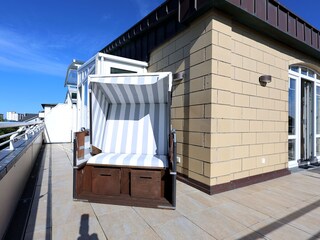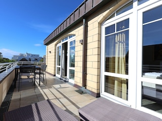 Die traumhafte 3 Zimmer Ferienwohnung ca. 100 m² für 5 Personen verfügt über zwei Doppel-Schlafräume jeweils mit Zugang zur großen Dachterrasse, einem Wannenbad, einem Duschbad, über ein helles und gemütlich eingerichtetes Wohnzimmer mit gemütlicher Sitzgruppe, Flachbild...