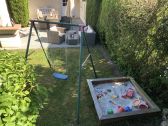 - Der Außengrill ohne Abdeckung, daher Grillrost verkrustet und verdreckt. Sandkiste gefährlich wg. hervorstehender Nägel.