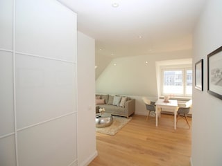 Die helle, freundliche Ferienwohnung im 2. Obergeschoss in Süd-Ost-Lage bietet ausreichend Platz für 2 Personen. Vom Wohnraumfenster aus kann man die Pfahlbauten am Strand hinter dem Deich erblicken.