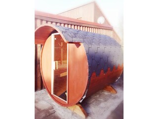 Entspannen Sie sich in der Fasssauna und genießen Sie den gemütlichen Garten.