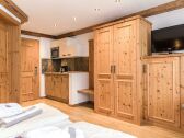 * Küche und Wohnraum mit Couch und romantischem Kamin