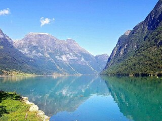 Gemütliches Ferienhaus nur etwa 15 m vom Seeufer des Oldevatnet entfernt und mit eigener Strandlinie. Eine Oase der Stille und Ruhe, ohne TV und Internet. Das Ferienhaus bietet dafür Ausblick zum Wasser. Offenes Wohnzimmer mit Tür...