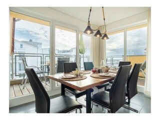 Die Penthaus-Wohnung verfügt über einen lichtdurchfluteten Wohnbereich mit einer gemütlichen Sitzecke mit Kaminofen, einer Essecke mit Blick zum Meer und der angrenzenden offenen Küchenzeile. Vom Wohnbereich aus...