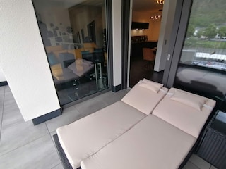 Großzügiger Balkon mit Liegen, Sitzgruppe und Blick auf die Reichsburg...