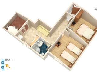 Ferienwohnung bietet Platz für 5 Gäste. Die Betten sind in Schlafzimmern, die es 2 gibt, und in Wohnzimmer, innerhalb einer Gesamtfläche von 45m2, angeo...