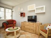 Schöne, zentrale, strandnahe Zwei-Raum-Erdgeschosswohnung mit Garten, teilweise Meerblick (Wohnzimmer /Terrasse),Stellplatz, Bollerwagen, WLAN.