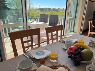 Wohnzimmer: Sitzbereich mit Smart-TV, großer Esstisch, offene Einbauküche mit Ceran-Kochfeld, Backofen, Mikrowelle, Kühlschrank, Geschirrspüler, Kaffee- und Nespressomaschine, Wasserkocher und Toaster, Leseecke sowie Kaminofen. Südbalkon mit komfortabler Möblierung und Markise. Spitzboden mit Galerie, Spieltisch und ausziehbarer Doppelschlafcouch....