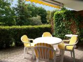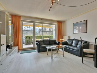 Genießen Sie einen gemütlichen Wohn-Essbereich mit einer sonnigen Terrasse, die zum Kurpark ausgerichtet ist.