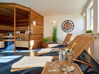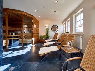 Im Souterrain des Hauses steht ein kleiner Wellnessbereich mit Sauna, Duschen, WC und Ruhezone kostenlos zur Verfügung. Gegen Gebühr finden Sie dort auch eine Waschmaschine, einen Trockner und ein Solarium vor. Bügelutensilien erhalten Sie kostenlos auf...