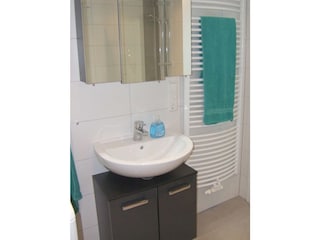 Das Badezimmer mit bodentiefer Dusche, Waschbecken, WC,...