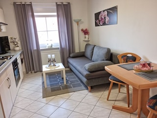 Im Wohn- und Kochbereich befindet sich eine gemütliche Sitzsofa mit einer weiteren Schlafmöglichkeit....